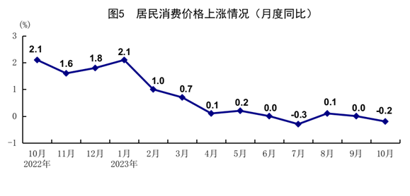 10月份,全國居民消費(fèi)價(jià)格(CPI)同比下降0.2%,環(huán)比下降0.1%。分類別看,食品煙酒價(jià)格同比下降2.1%,衣著價(jià)格上漲1.1%,居住價(jià)格上漲0.3%,生活用品及服務(wù)價(jià)格下降0.6%,交通通信價(jià)格下降0.9%,教育文化娛樂價(jià)格上漲2.3%,醫(yī)療保健價(jià)格上漲1.3%,其他用品及服務(wù)價(jià)格上漲3.6%。在食品煙酒價(jià)格中,豬肉價(jià)格下降30.1%,鮮菜價(jià)格下降3.8%,糧食價(jià)格上漲0.6%,鮮果價(jià)格上漲2.2%??鄢称泛湍茉磧r(jià)格后的核心CPI同比上漲0.6%。1-10月份,全國居民消費(fèi)價(jià)格同比上漲0.4%。